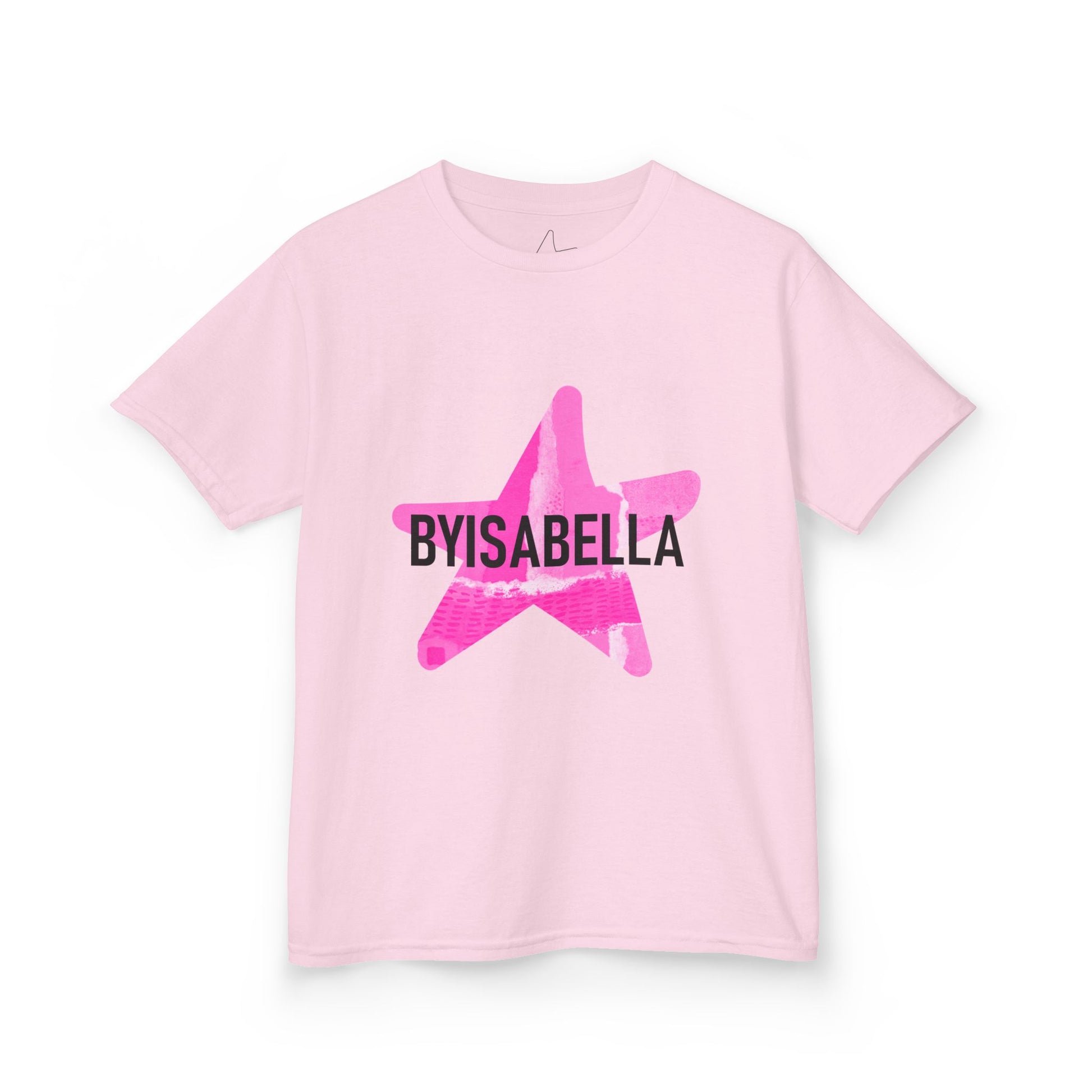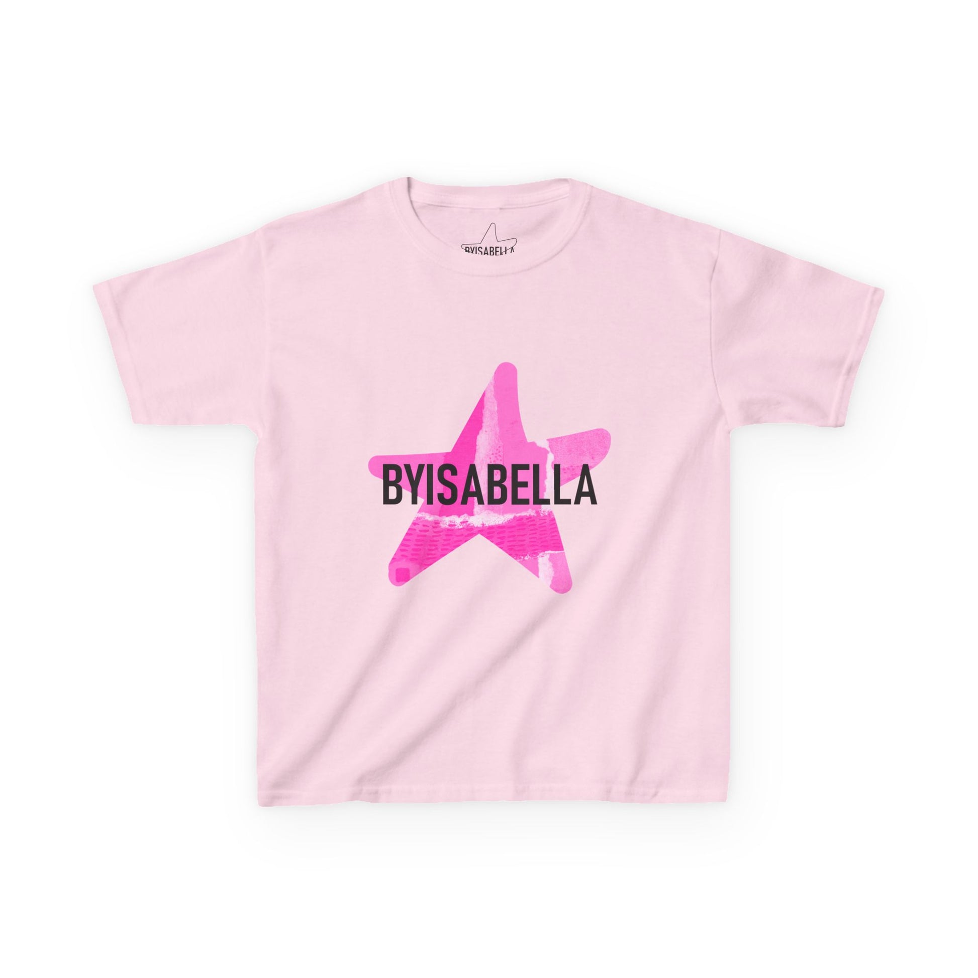 100% cotton baby tee with 'Pretty In Pink' byisabella logo design.
